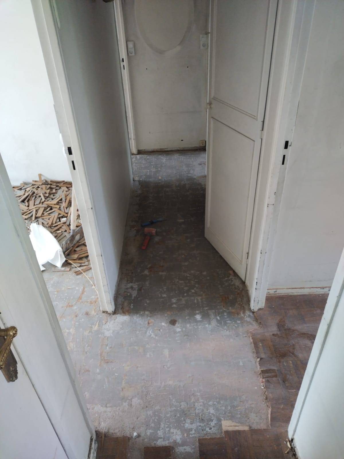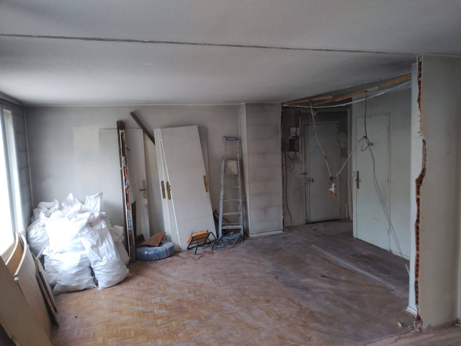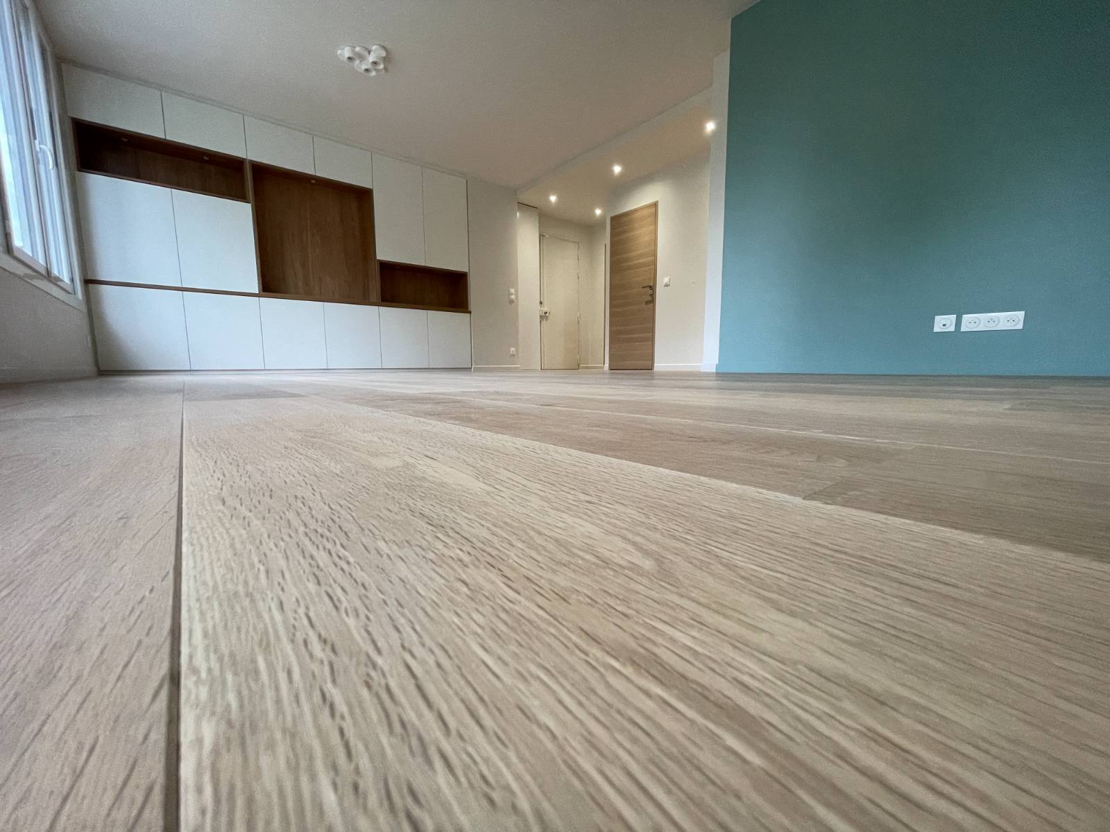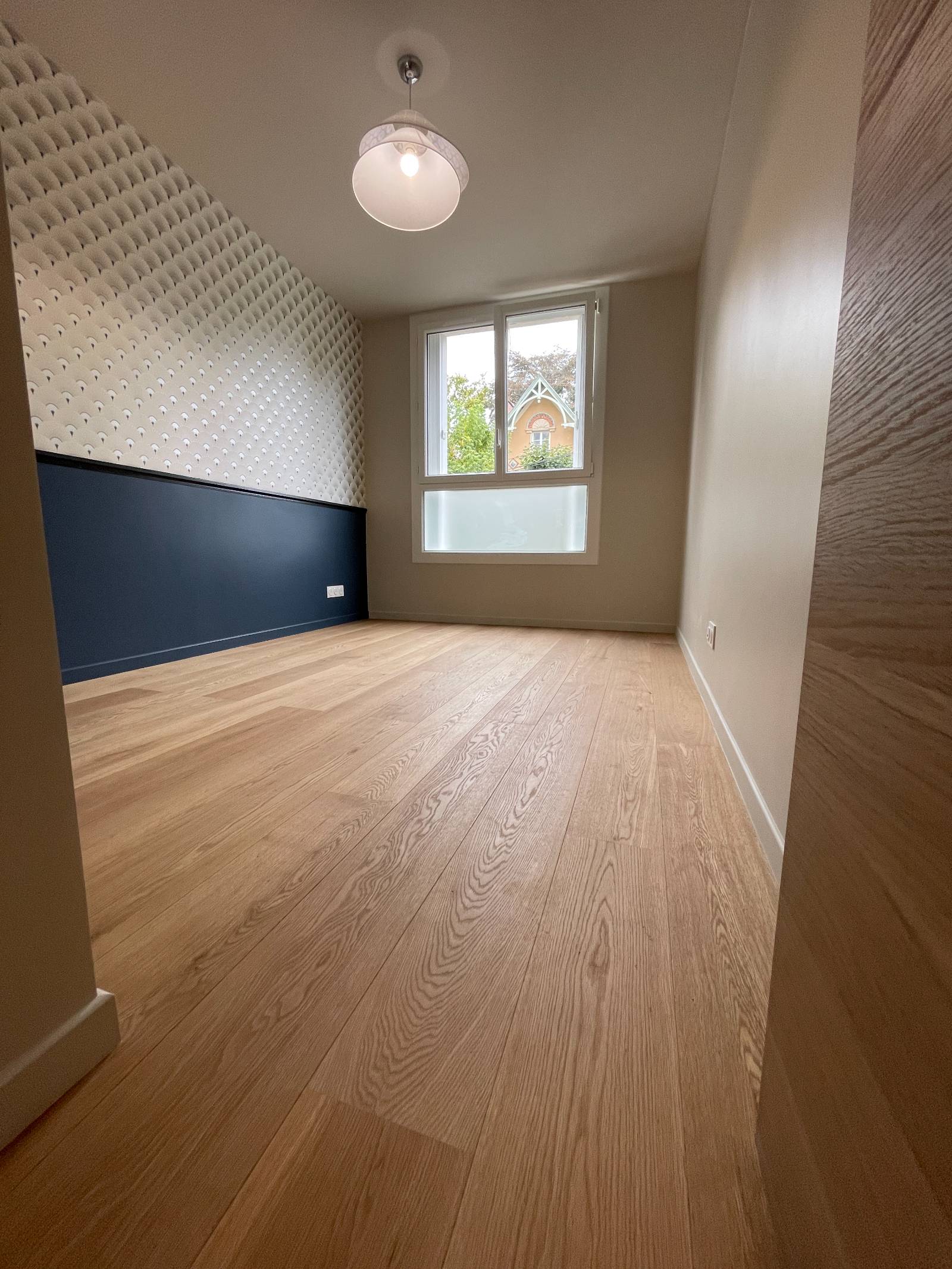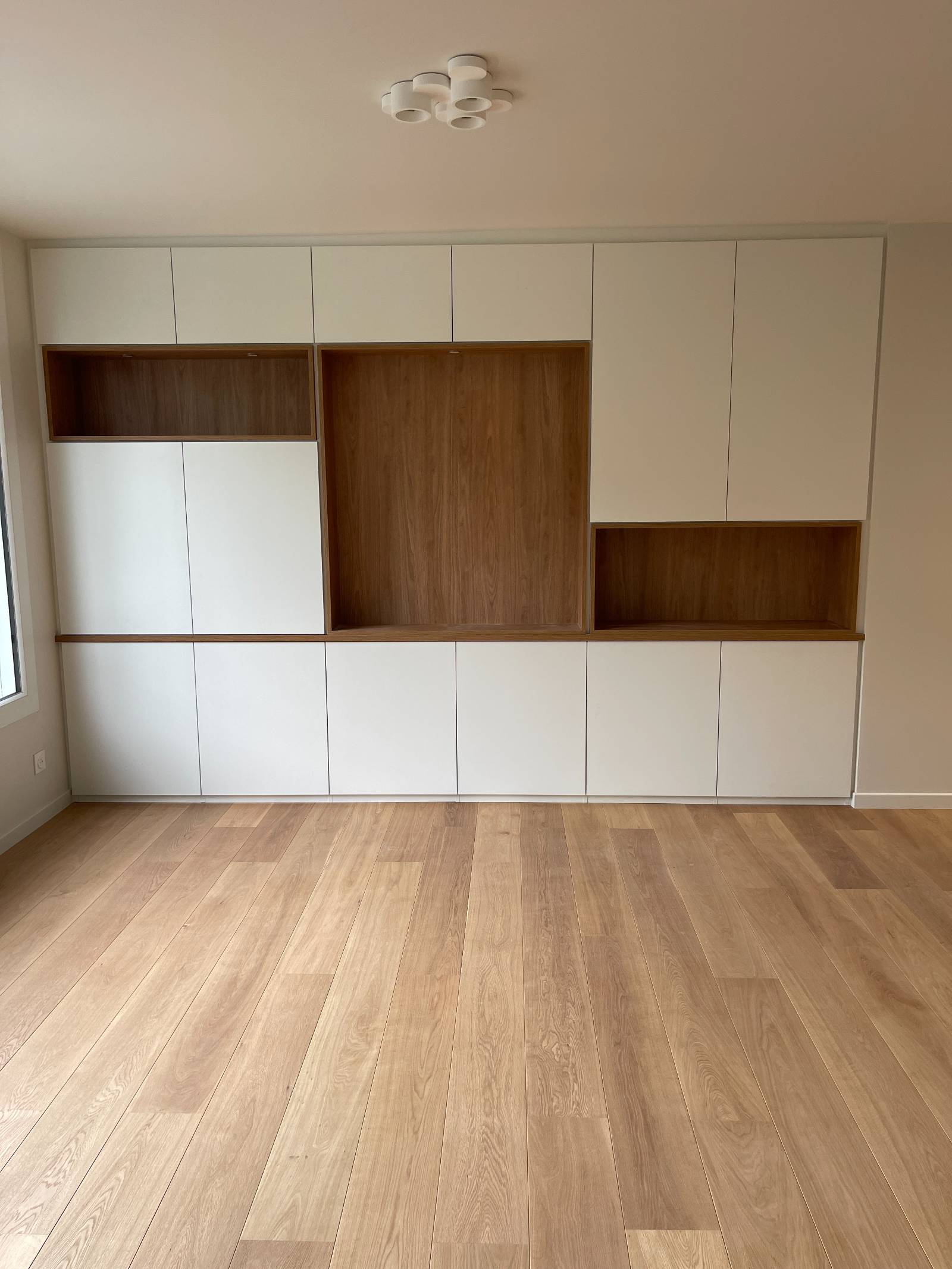 Transformation intégrale d’un appartement ancien (démolition des cloisons et ragréage des sols, création d’un séjour avec meuble mural sur-mesure, installation d’une cuisine équipée bleu-vert et plan de travail bois, rénovation complète de la salle de bain et des WC suspendus, mise à neuf de la plomberie et de l’électricité, pose de parquet chêne naturel, finitions peinture).