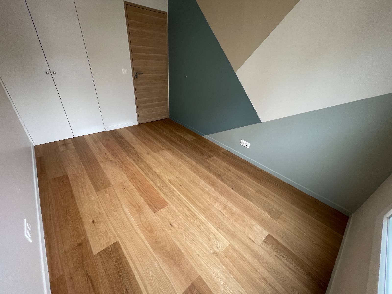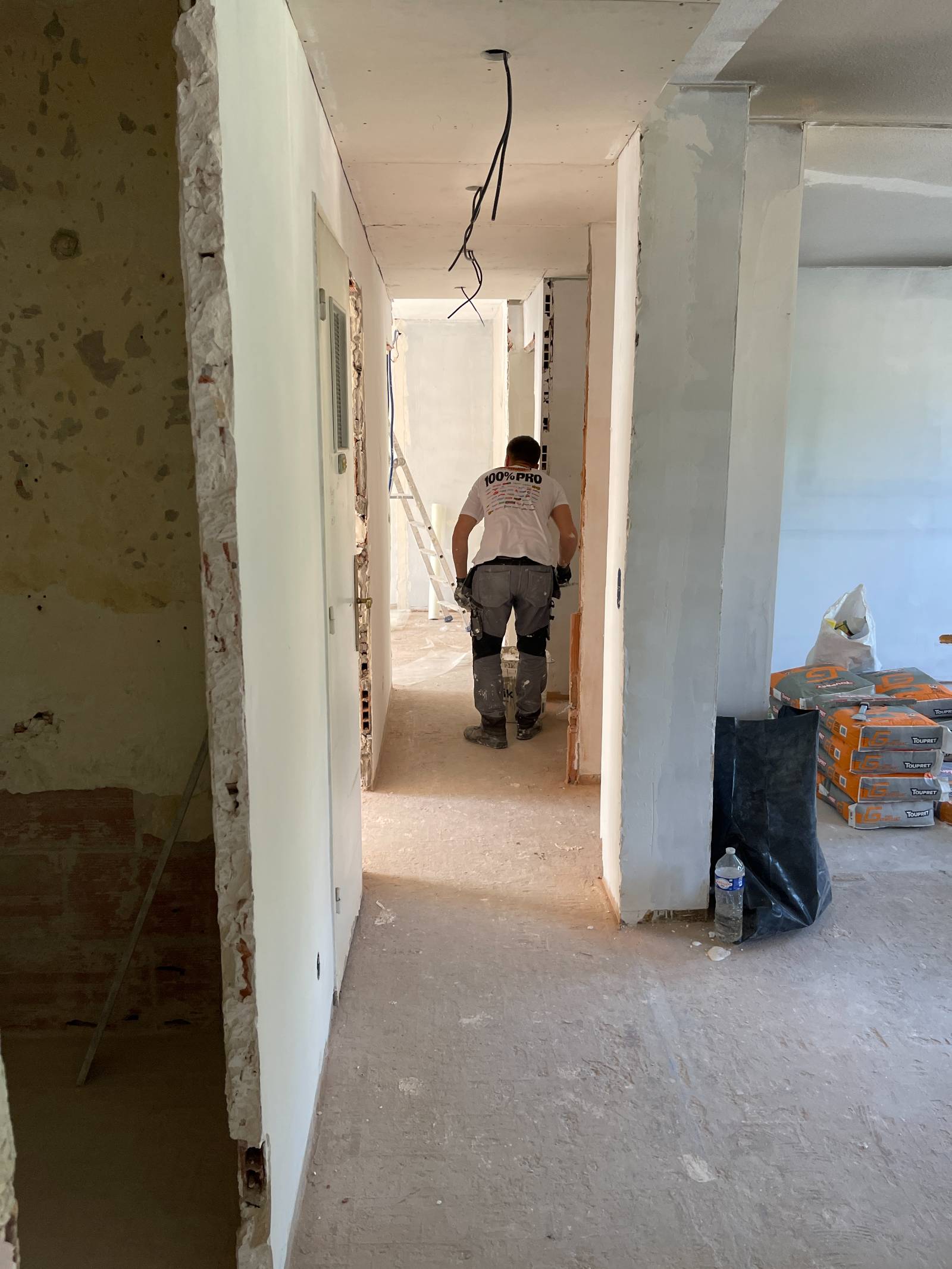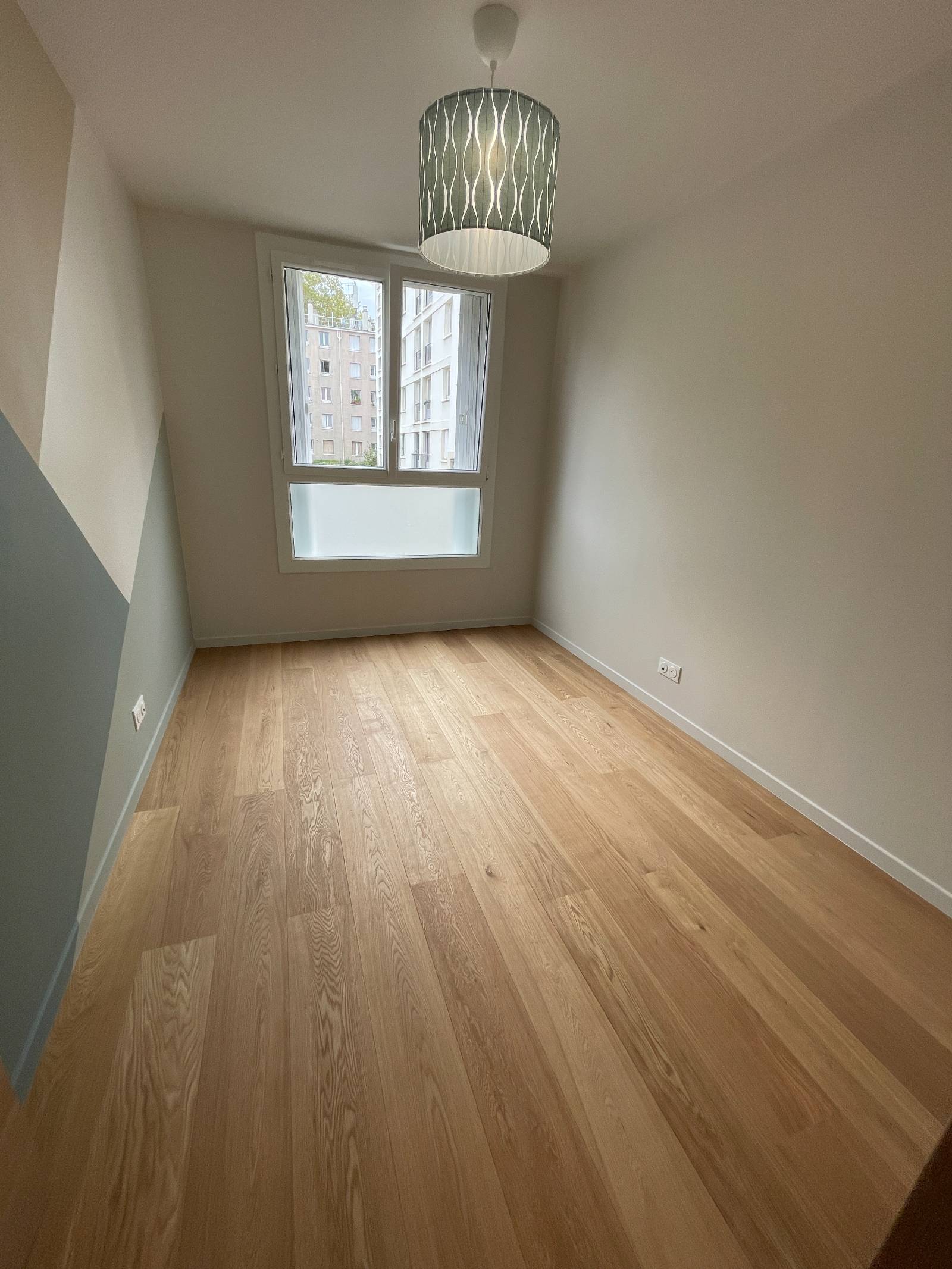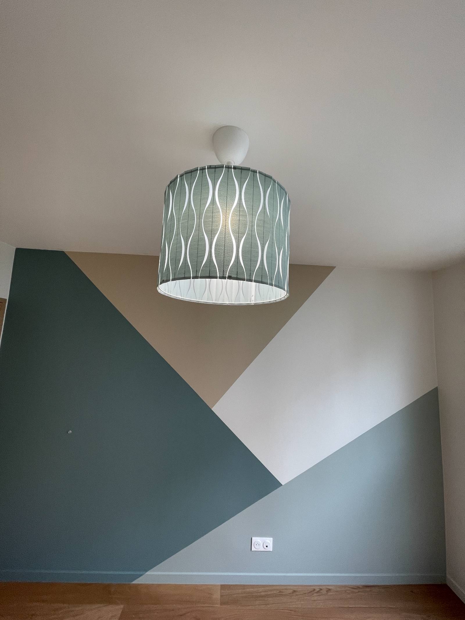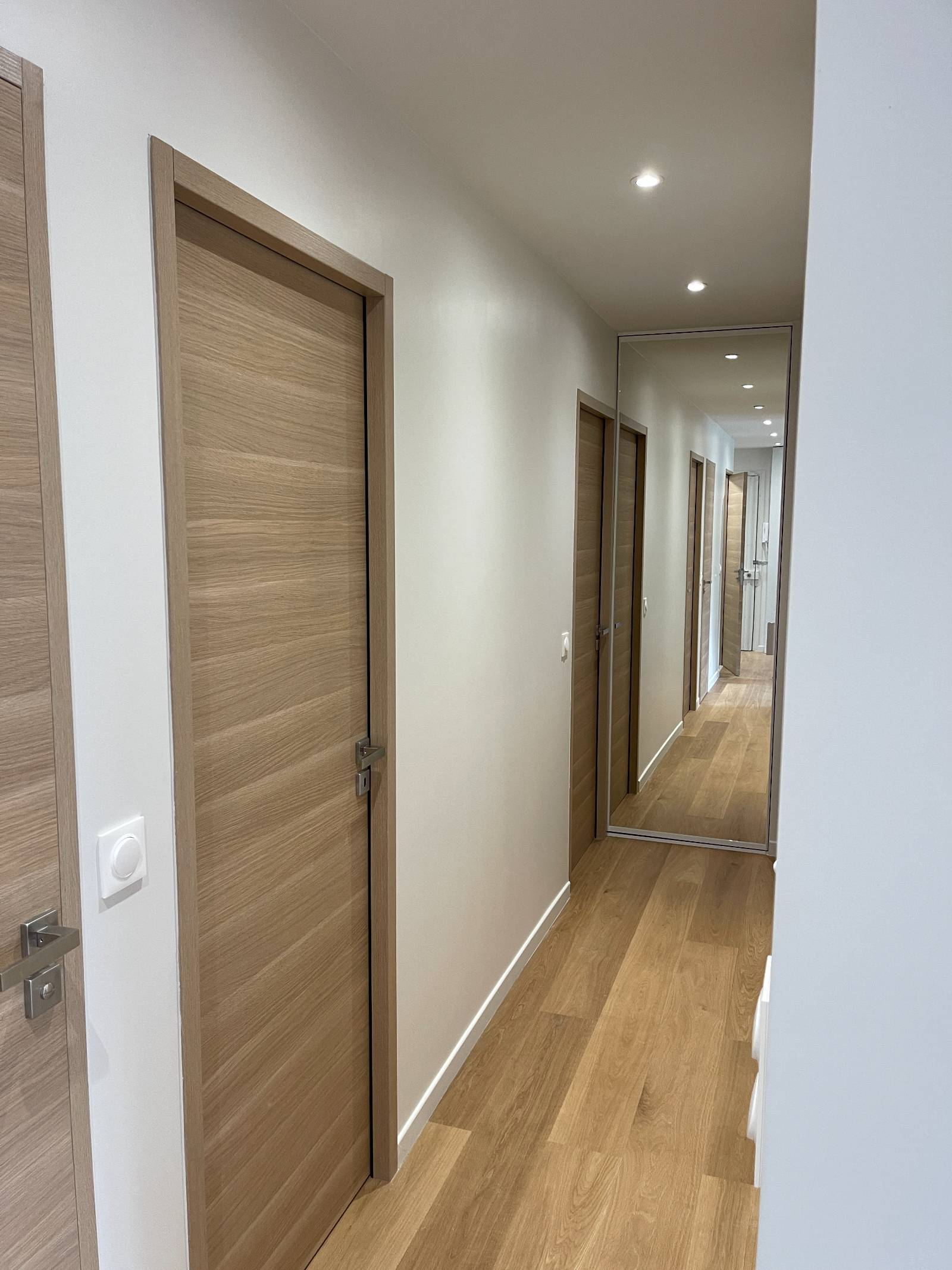 Transformation intégrale d’un appartement ancien (démolition des cloisons et ragréage des sols, création d’un séjour avec meuble mural sur-mesure, installation d’une cuisine équipée bleu-vert et plan de travail bois, rénovation complète de la salle de bain et des WC suspendus, mise à neuf de la plomberie et de l’électricité, pose de parquet chêne naturel, finitions peinture).