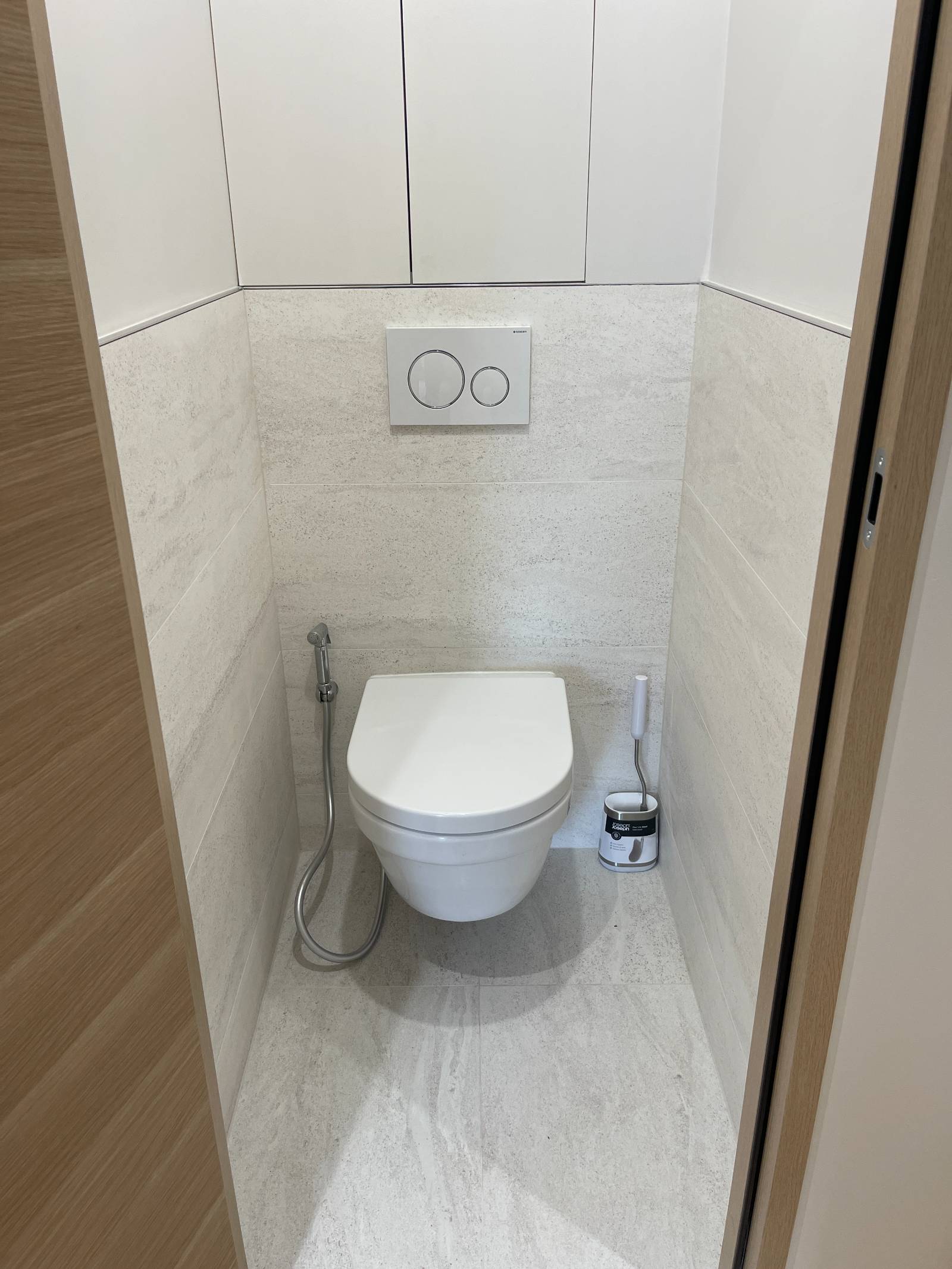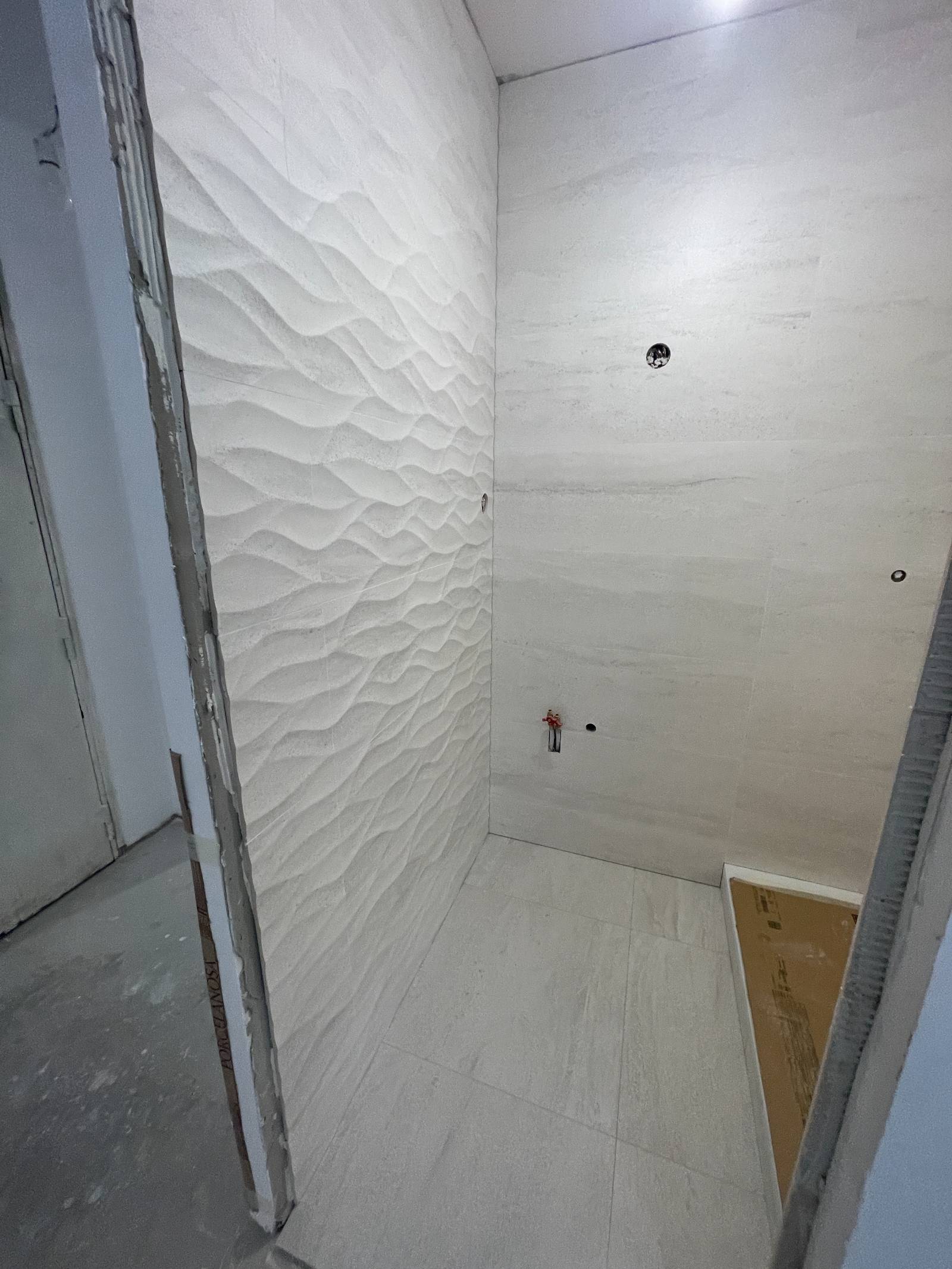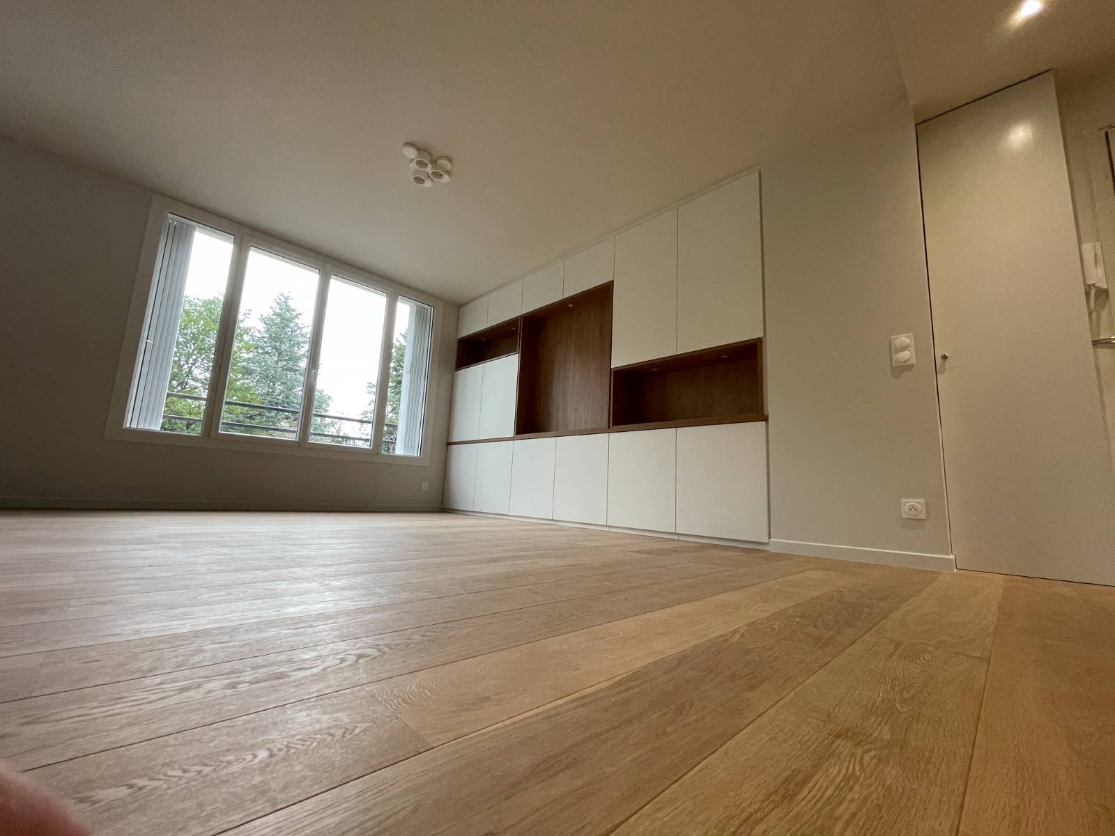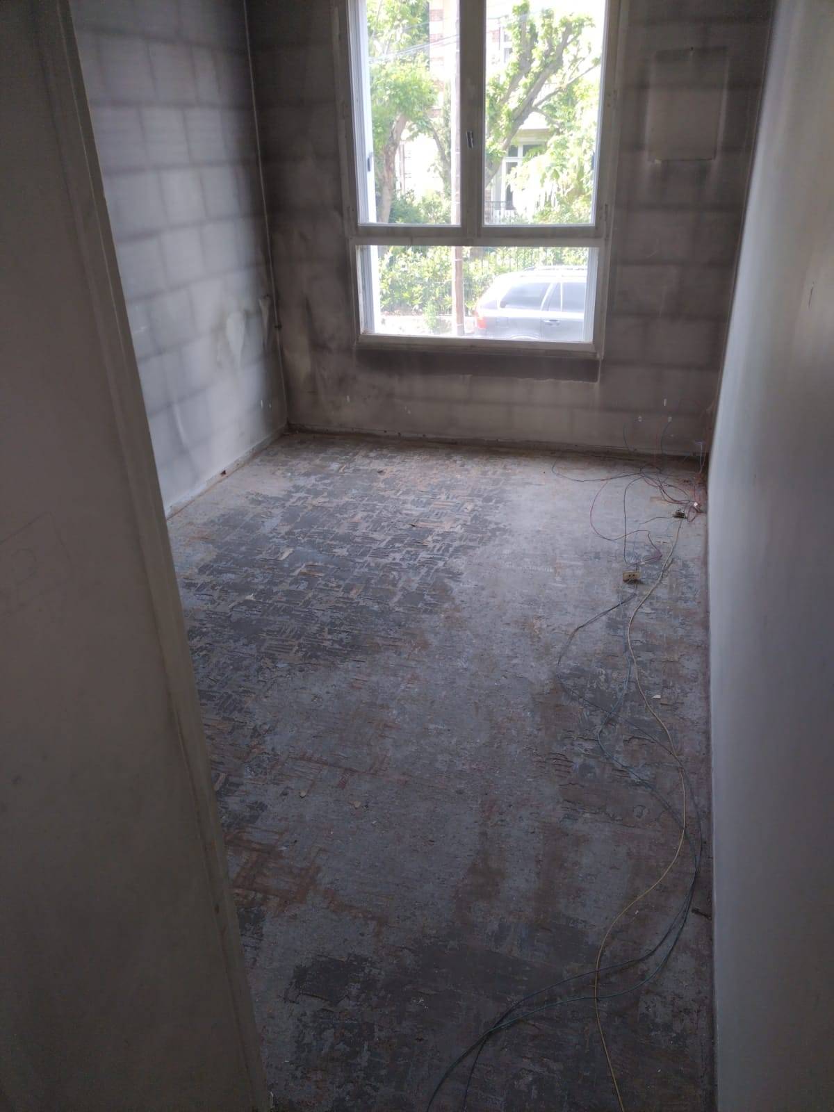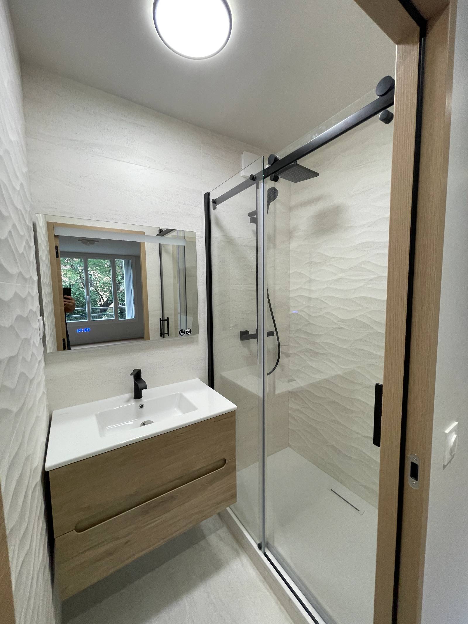 Transformation intégrale d’un appartement ancien (démolition des cloisons et ragréage des sols, création d’un séjour avec meuble mural sur-mesure, installation d’une cuisine équipée bleu-vert et plan de travail bois, rénovation complète de la salle de bain et des WC suspendus, mise à neuf de la plomberie et de l’électricité, pose de parquet chêne naturel, finitions peinture).