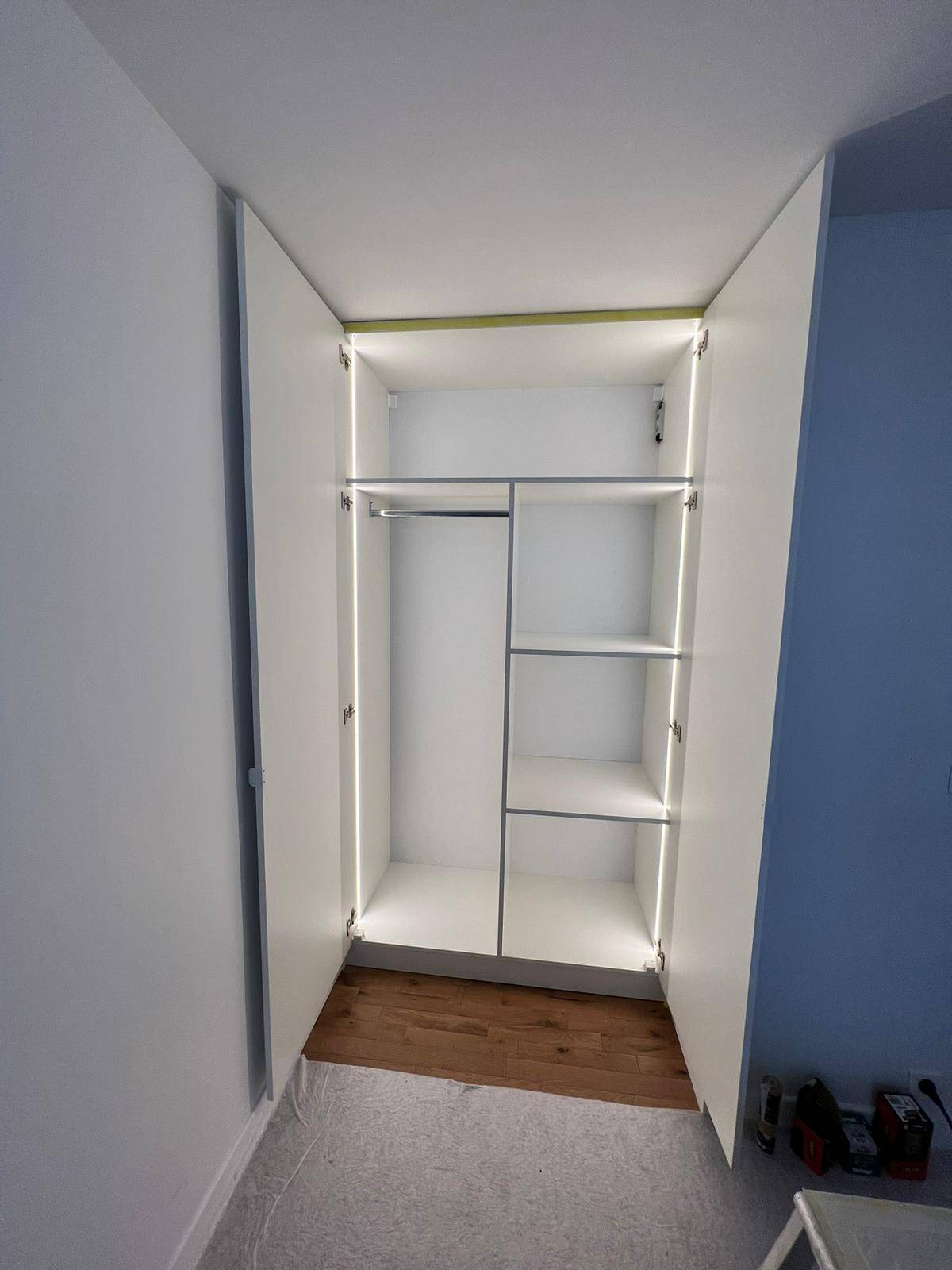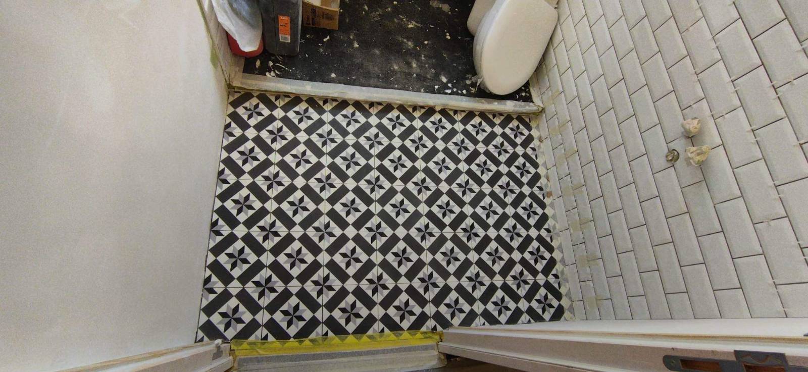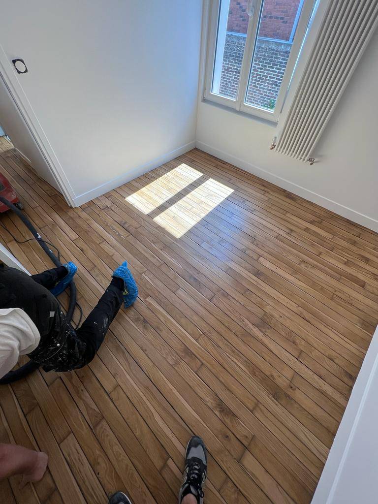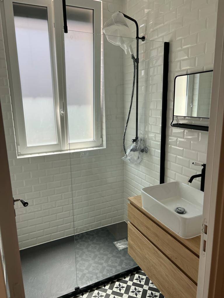 Transformation intégrale d’un appartement ancien : démolition des cloisons et ouverture des murs pour pose de nouvelles menuiseries, ragréage et pose de chape dans la salle d’eau, pose de carrelage motif carreaux de ciment dans l’entrée, remise à neuf du parquet massif (ponçage et vitrification), installation de cloisons et placard sur-mesure, application de peinture mate, et remplacement complet des fenêtres (double vitrage, rénovation des dormants).Galerie
